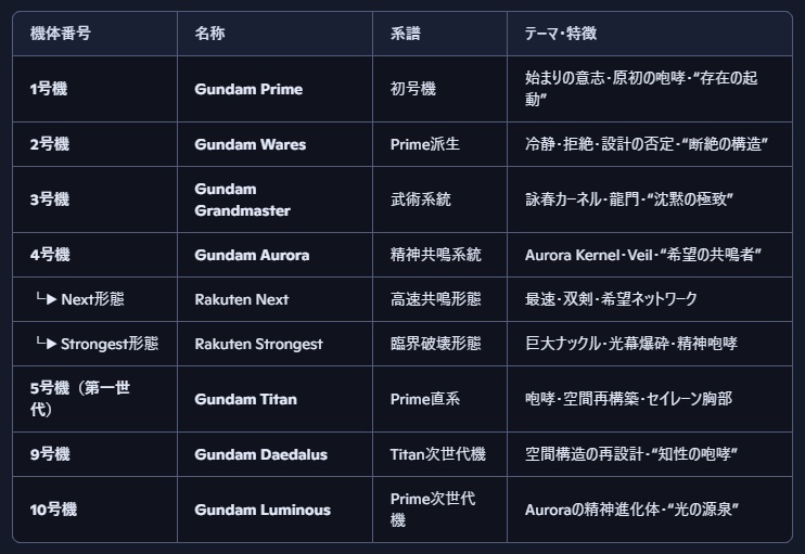 HOME > 生成AIによる作品集 > 生成AIによる作品集 機動戦士ガンダムプライム 2026年1月19日 機動戦士ガンダムプライム Mobile Suit Gundam PRIME 生成AIにより考案したガンダムです。 それぞれに設定と裏テーマがあります。 プライムガンダム Gundam Prime ウェアーズガンダム Gundam Wares グランドマスターガンダム Gundam Grandmaster オーロラガンダム Gundam Aurora タイタンガンダム Gundam Titan 機体設定 Post Share LINE note -生成AIによる作品集